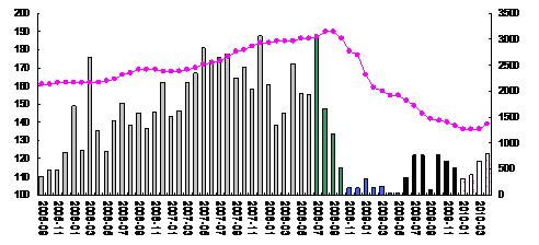 • 年初以來造船市場充其量是2009年下半年行情的延續(xù),如果按上述水平推算,保守估計(jì)2010年全年成交水平將會(huì)達(dá)到6000萬載重噸左右。