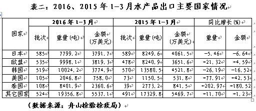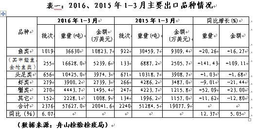 “十三五”規(guī)劃開局之年的開局之季,2016年1-3月舟山市水產(chǎn)品對外貿(mào)易迎來了開門紅,出口批次、出口量及出口額全線飄紅,一舉扭轉(zhuǎn)了2015年下降態(tài)勢。