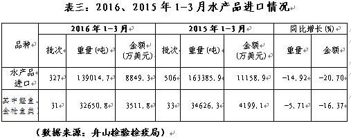 2016年1-3月舟山水產(chǎn)品進口下降,具體見表三: